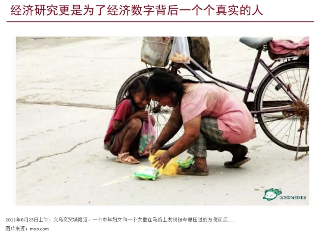 小散师傅: 学经济是因为:看到了徐高老师的《宏观经济二十五讲》。他的讲课中有一张图让我很是触动且惭愧(我每次想偷懒就翻出来看看👀),我觉得让他们(下方图片中的人)过得更好是我想做的事情。但后来,做了一些经济学相关的事(研究金融危机和大衰退/做经济学实证研究)以及听到了老师说的一句话:“写是一回事,采纳又是一回事”,我就发现:只有能有实际用途和影响力的东西才是重要的。还记得《宏观经济学二十五讲:中国视角》中经典的一句话,凯恩斯说:“从长远看,我们都已死去”。所以,人生实属短暂,我们应当在短时间内接触更有为主义的事情,现在就要让他实现。